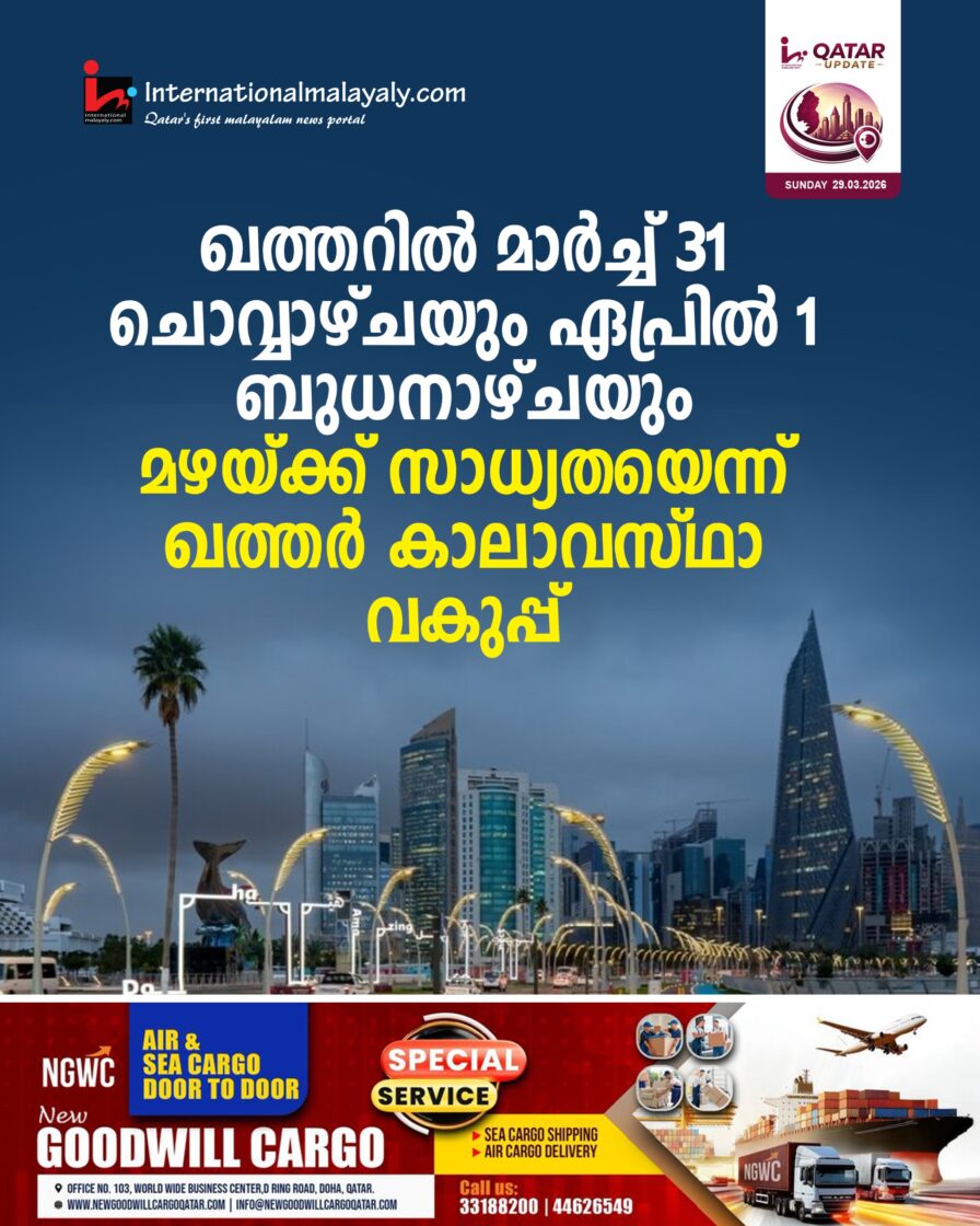 ഖത്തറില് മാര്ച്ച് 31 ചൊവ്വാഴ്ചയും ഏപ്രില് 1 ബുധനാഴ്ചയും മഴയ്ക്ക് സാധ്യതയെന്ന് ഖത്തര് കാലാവസ്ഥാ വകുപ്പ്