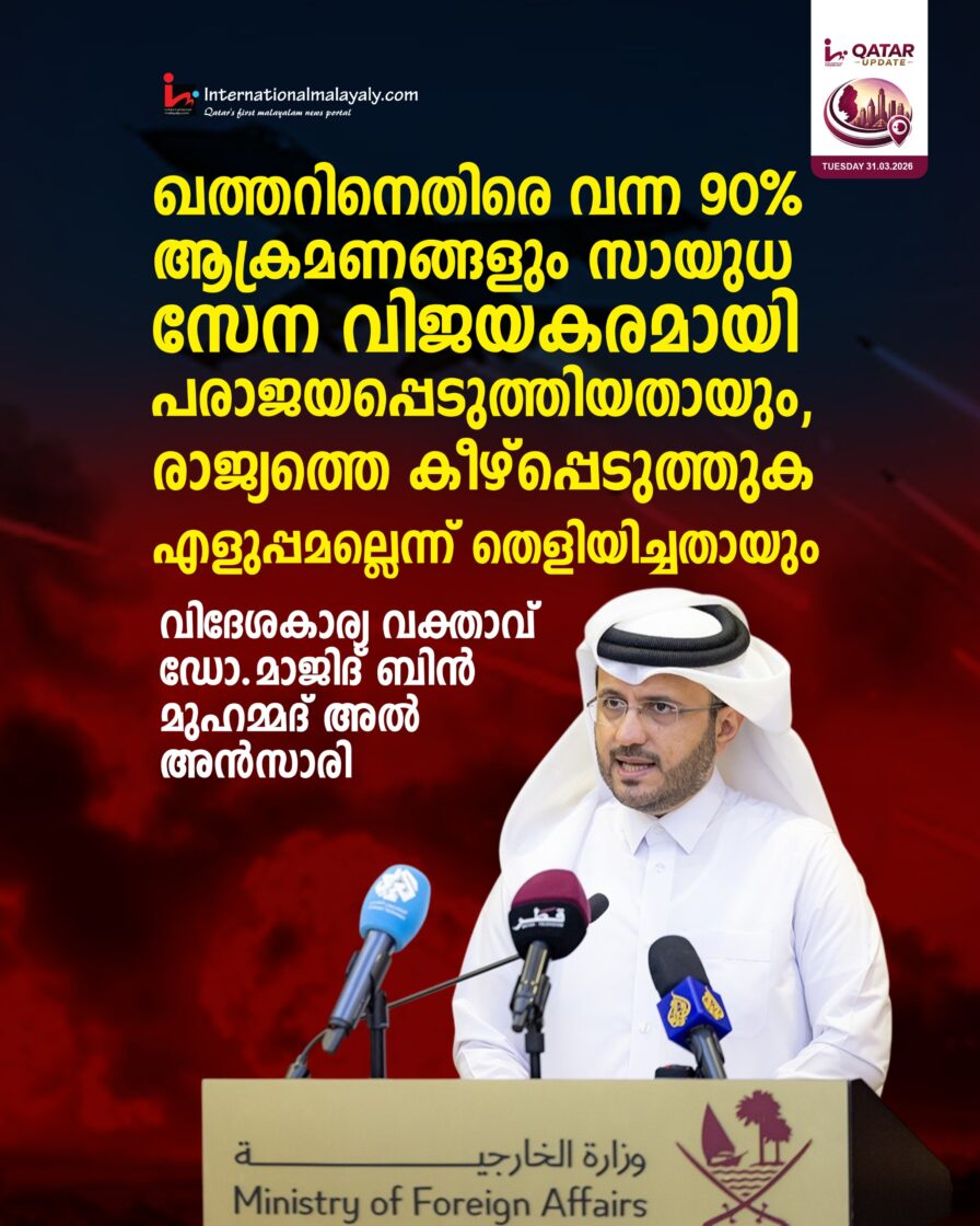 ഖത്തറിനെതിരെ വന്ന 90% ആക്രമണങ്ങളും സായുധ സേന വിജയകരമായി പരാജയപ്പെടുത്തിയതായം , രാജ്യത്തെ കീഴ്പ്പെടുത്തുക എളുപ്പമല്ലെന്ന് തെളിയിച്ചതായും പ്രധാനമന്ത്രിയുടെ ഉപദേഷ്ടാവും മന്ത്രാലയ വക്താവുമായ ഡോ.മാജിദ് ബിന് മുഹമ്മദ് അല് അന്സാരി