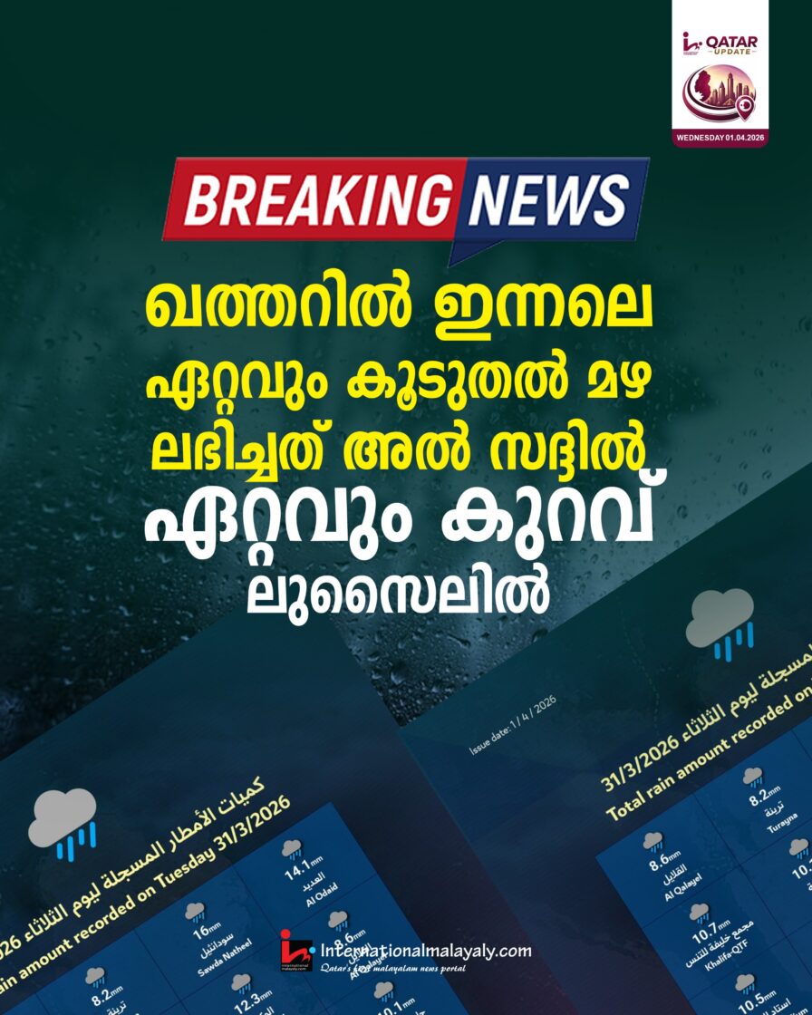 ഖത്തറില് ഇന്നലെ ഏറ്റവും കൂടുതല് മഴ ലഭിച്ചത് അല് സദ്ദില്, ഏറ്റവും കുറവ് ലുസൈലില്