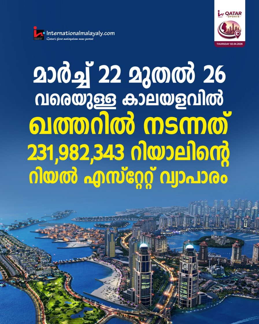 മാര്ച്ച് 22 മുതല് 26 വരെയുള്ള കാലയളവില് ഖത്തറില് നടന്നത് 231,982,343 റിയാലിന്റെ റിയല് എസ്റ്റേറ്റ് വ്യാപാരം