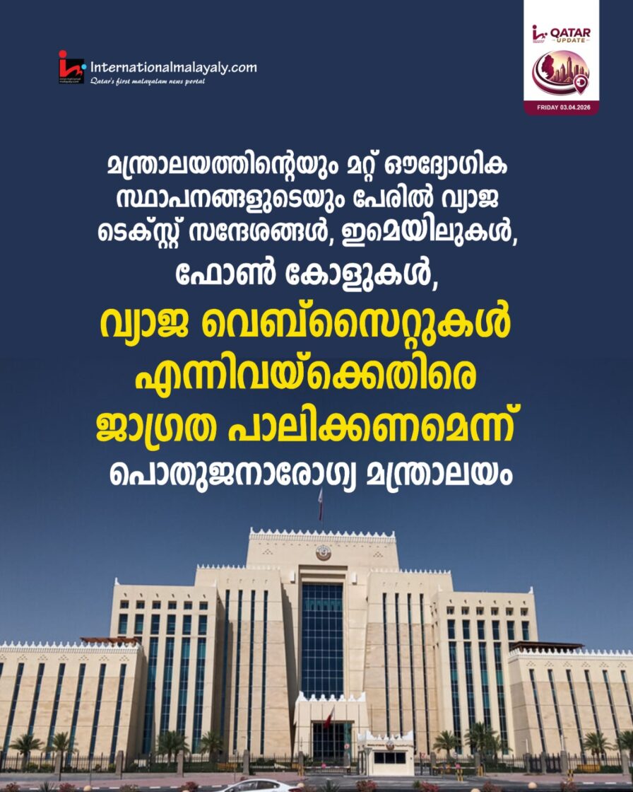 മന്ത്രാലയത്തിന്റെയും മറ്റ് ഔദ്യോഗിക സ്ഥാപനങ്ങളുടെയും പേരില് വ്യാജ ടെക്സ്റ്റ് സന്ദേശങ്ങള്, ഇമെയിലുകള്, ഫോണ് കോളുകള്, വ്യാജ വെബ്സൈറ്റുകള് എന്നിവയ്ക്കെതിരെ ജാഗ്രത പാലിക്കണമെന്ന് പൊതുജനാരോഗ്യ മന്ത്രാലയം പൊതുജനങ്ങളോട് അഭ്യര്ത്ഥിച്ചു