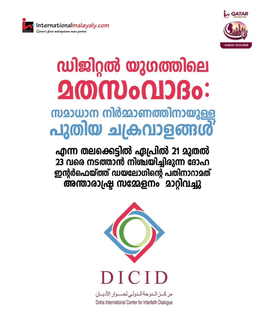 ഡിജിറ്റല് യുഗത്തിലെ മതസംവാദം: സമാധാന നിര്മ്മാണത്തിനായുള്ള പുതിയ ചക്രവാളങ്ങള്’ എന്ന തലക്കെട്ടില് ഏപ്രില് 21 മുതല് 23 വരെ നടത്താന് നിശ്ചയിച്ചിരുന്ന ദോഹ ഇന്റര്ഫെയ്ത്ത് ഡയലോഗിന്റെ പതിനാറാമത് അന്താരാഷ്ട്ര സമ്മേളനം മാറ്റിവച്ചു