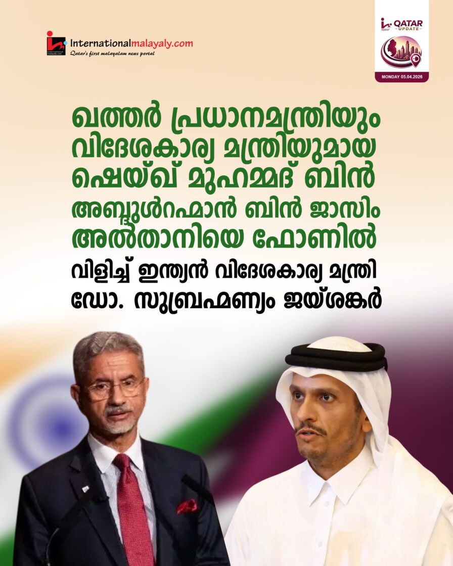 ഖത്തര് പ്രധാനമന്ത്രിയും വിദേശകാര്യ മന്ത്രിയുമായ ഷെയ്ഖ് മുഹമ്മദ് ബിന് അബ്ദുള്റഹ്മാന് ബിന് ജാസിം അല്താനിയെ ഫോണില് വിളിച്ച് ഇന്ത്യന് വിദേശകാര്യ മന്ത്രി ഡോ. സുബ്രഹ്മണ്യം ജയ്ശങ്കര്