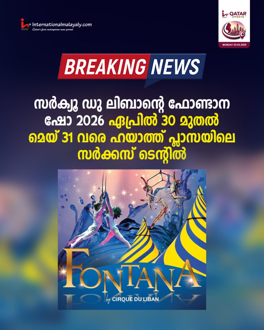 സര്ക്യൂ ഡു ലിബാന്റെ പ്രശസ്തമായ വാട്ടര് സര്ക്കസായ ഫോണ്ടാന ഷോ 2026 ഏപ്രില് 30 മുതല് മെയ് 31 വരെ ഹയാത്ത് പ്ലാസയിലെ സര്ക്കസ് ടെന്റില് നടക്കുമെന്ന് വിസിറ്റ് ഖത്തര് പ്രഖ്യാപിച്ചു. നേരത്തെ മാര്ച്ച് 20 മുതല് ഏപ്രില് 18 വരെയാണ് പരിപാടി പ്ളാന് ചെയ്തിരുന്നത്.