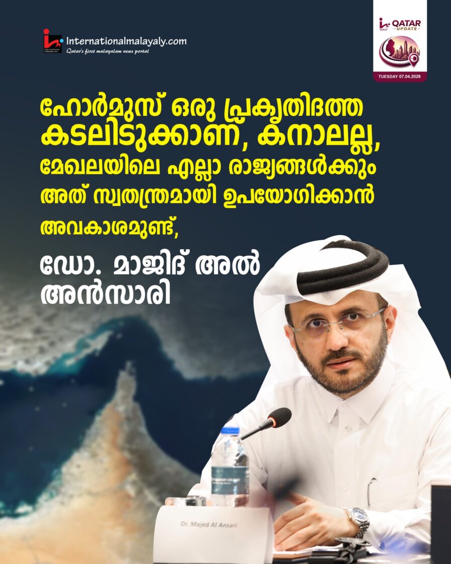 ലോകത്തിലെ ഏറ്റവും പ്രധാനപ്പെട്ട എണ്ണ ഗതാഗത സമുദ്ര ഇടനാഴിയായ ഹോര്മുസ് ഏതെങ്കിലും രാജ്യം നിര്മിച്ച കലാലല്ലെന്നും മേഖലയിലെ എല്ലാ രാജ്യങ്ങള്ക്കും അത് സ്വതന്ത്രമായി ഉപയോഗിക്കാന് അവകാശമുണ്ടെന്നും ഖത്തര് വിദേശകാര്യ മന്ത്രാലയ വക്താവ് ഡോ. മാജിദ് അല് അന്സാരി അഭിപ്രായപ്പെട്ടു.