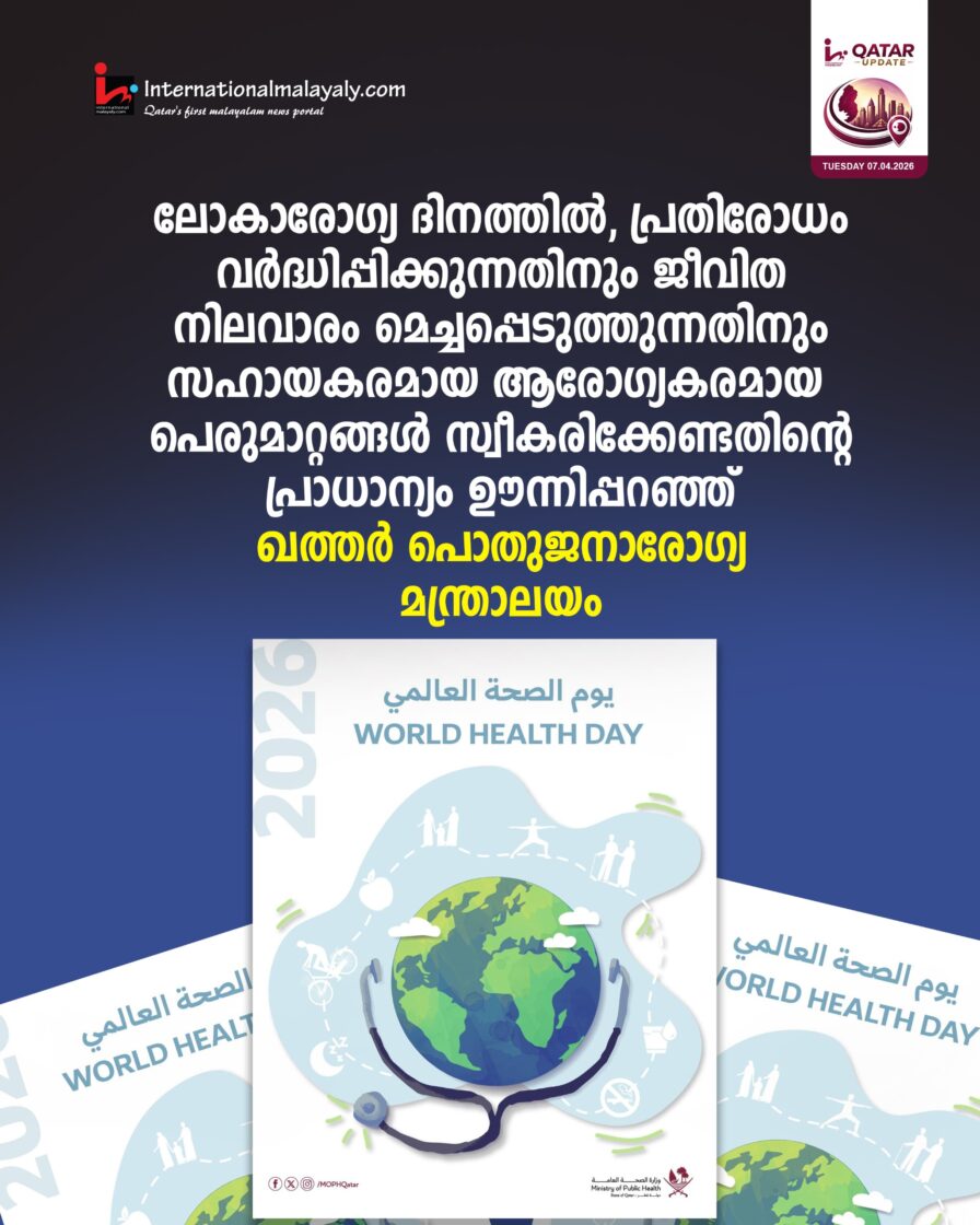 ലോകാരോഗ്യ ദിനത്തില്, പ്രതിരോധം വര്ദ്ധിപ്പിക്കുന്നതിനും ജീവിത നിലവാരം മെച്ചപ്പെടുത്തുന്നതിനും സഹായകരമായ ആരോഗ്യകരമായ പെരുമാറ്റങ്ങള് സ്വീകരിക്കേണ്ടതിന്റെ പ്രാധാന്യം ഊന്നിപ്പറഞ്ഞ് ഖത്തര് പൊതുജനാരോഗ്യ മന്ത്രാലയം