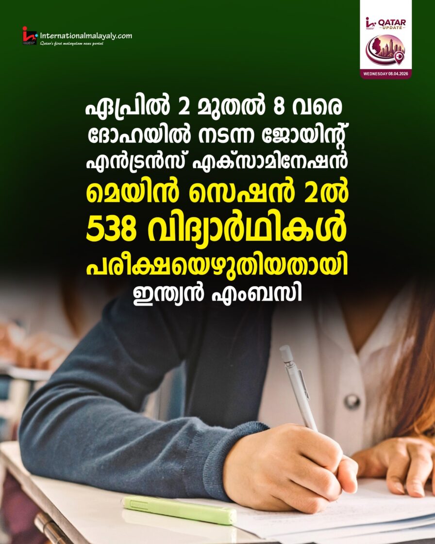 ഏപ്രില് 2 മുതല് 8 വരെ ദോഹയില് നടന്ന ജോയിന്റ് എന്ട്രന്സ് എക്സാമിനേഷന് മെയിന് സെഷന് 2 ല് 538 വിദ്യാര്ഥികള് പരീക്ഷയെഴുതിയതായി ഇന്ത്യന് എംബസി