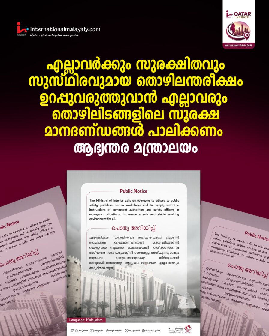 എല്ലാവര്ക്കും സുരക്ഷിതവും സുസ്ഥിരവുമായ തൊഴിലന്തരീക്ഷം ഉറപ്പുവരുത്തുവാന് എല്ലാവരും തൊഴിലിടങ്ങളിലെ സുരക്ഷ മാനദണ്ഡങ്ങള് പാലിക്കണം – ആഭ്യന്തര മന്ത്രാലയം