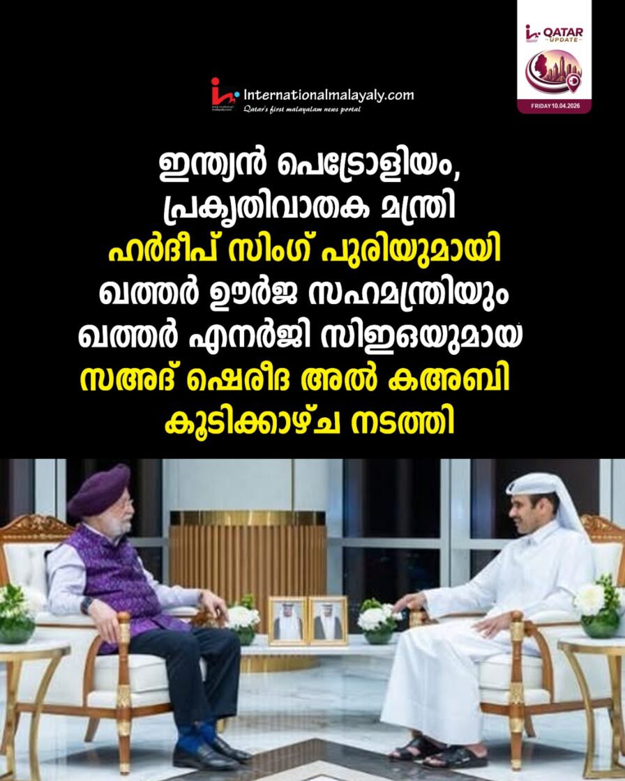 ഇന്ത്യന്‍ പെട്രോളിയം, പ്രകൃതിവാതക മന്ത്രി ഹര്‍ദീപ് സിംഗ് പുരിയുമായി ഖത്തര്‍ ഊര്‍ജ സഹമന്ത്രിയും ഖത്തര്‍ എനര്‍ജി സിഇഒയുമായ സഅദ് ഷെരീദ അല്‍-കഅബി കൂടിക്കാഴ്ച നടത്തി