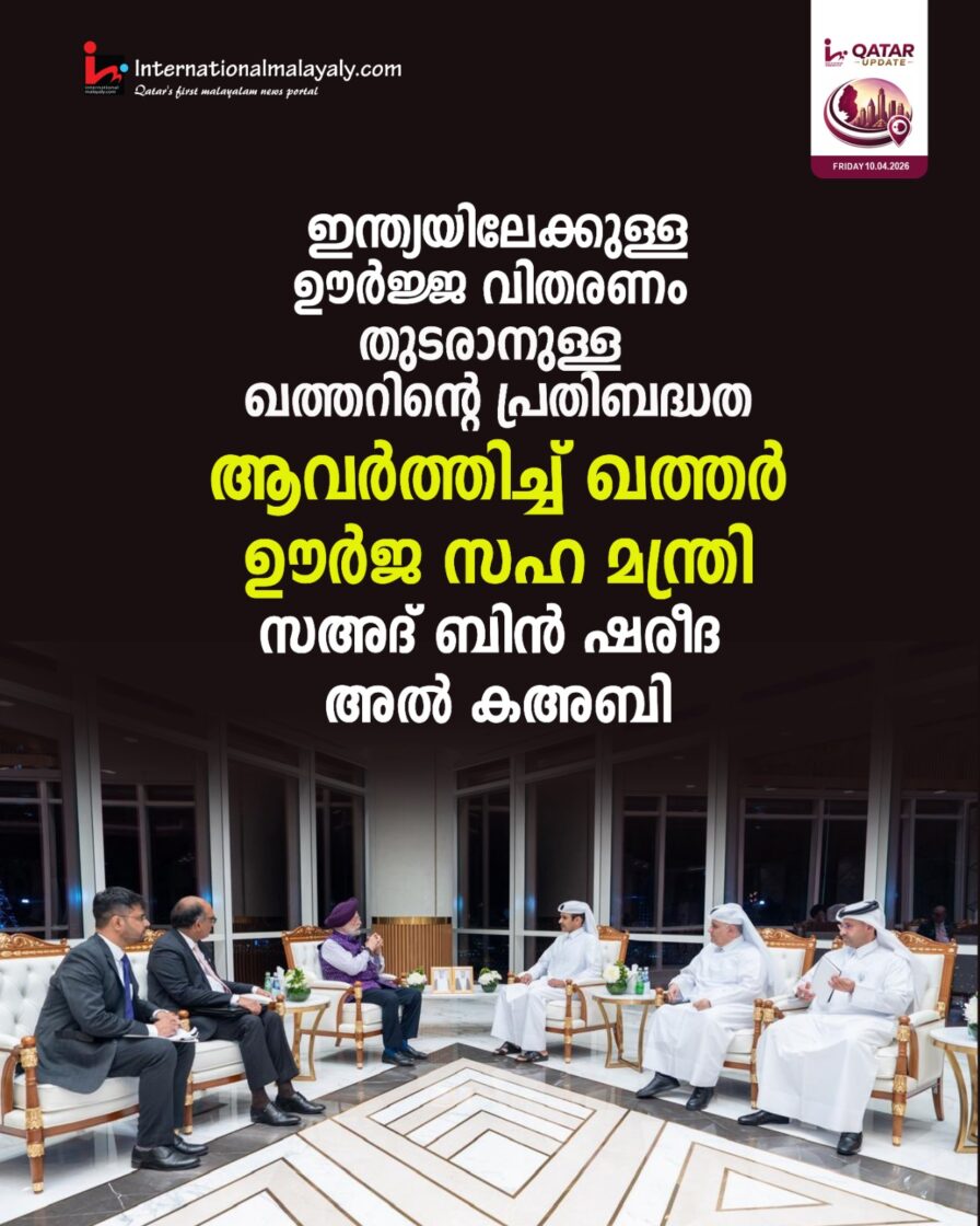 ഇന്ന് ഇന്ത്യന് പെട്രോളിയം, പ്രകൃതിവാതക മന്ത്രി ഹര്ദീപ് സിംഗ് പുരിയുമായി ദോഹയില് നടന്ന കൂടിക്കാഴ്ചയിലാണ് ഖത്തര് എനര്ജി സിഇഒ കൂടിയായ ഊര്ജ സഹ മന്ത്രി സഅദ് ബിന് ഷരീദ അല് കഅബി നിലപാട് വ്യക്തമാക്കിയത്.