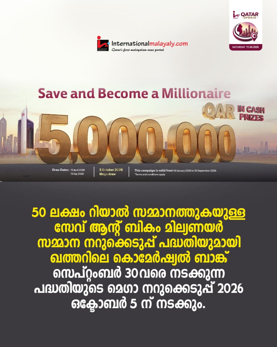 50 ലക്ഷം റിയാല് സമ്മാനത്തുകയുള്ള സേവ് ആന്റ് ബികം മില്യണയര് സമ്മാന നറുക്കെടുപ്പ് പദ്ധതിയുമായി ഖത്തറിലെ കൊമേര്ഷ്യല് ബാങ്ക് .സെപ്റ്റംബര് 30 വരെ നടക്കുന്ന പദ്ധതിയുടെ മെഗാ നറുക്കെടുപ്പ് 2026 ഒക്ടോബര് 5 ന് നടക്കും.