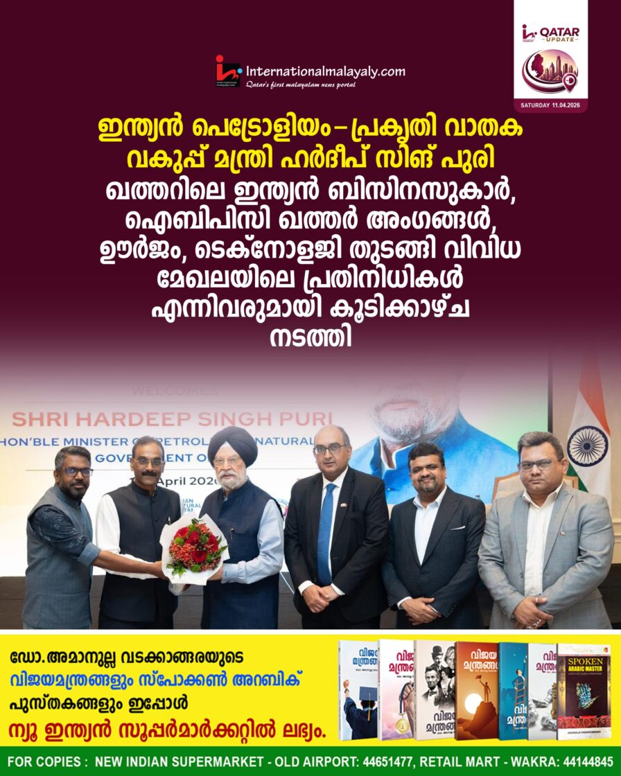ഹര്ദീപ് സിങ് പുരി ഖത്തറിലെ ഇന്ത്യന് ബിസിനസുകാര്, ഐബിപിസി ഖത്തര് അംഗങ്ങള്, ഊര്ജം, ടെക്നോളജി തുടങ്ങി വിവിധ മേഖലയിലെ പ്രതിനിധികള് എന്നിവരുമായി കൂടിക്കാഴ്ച നടത്തി