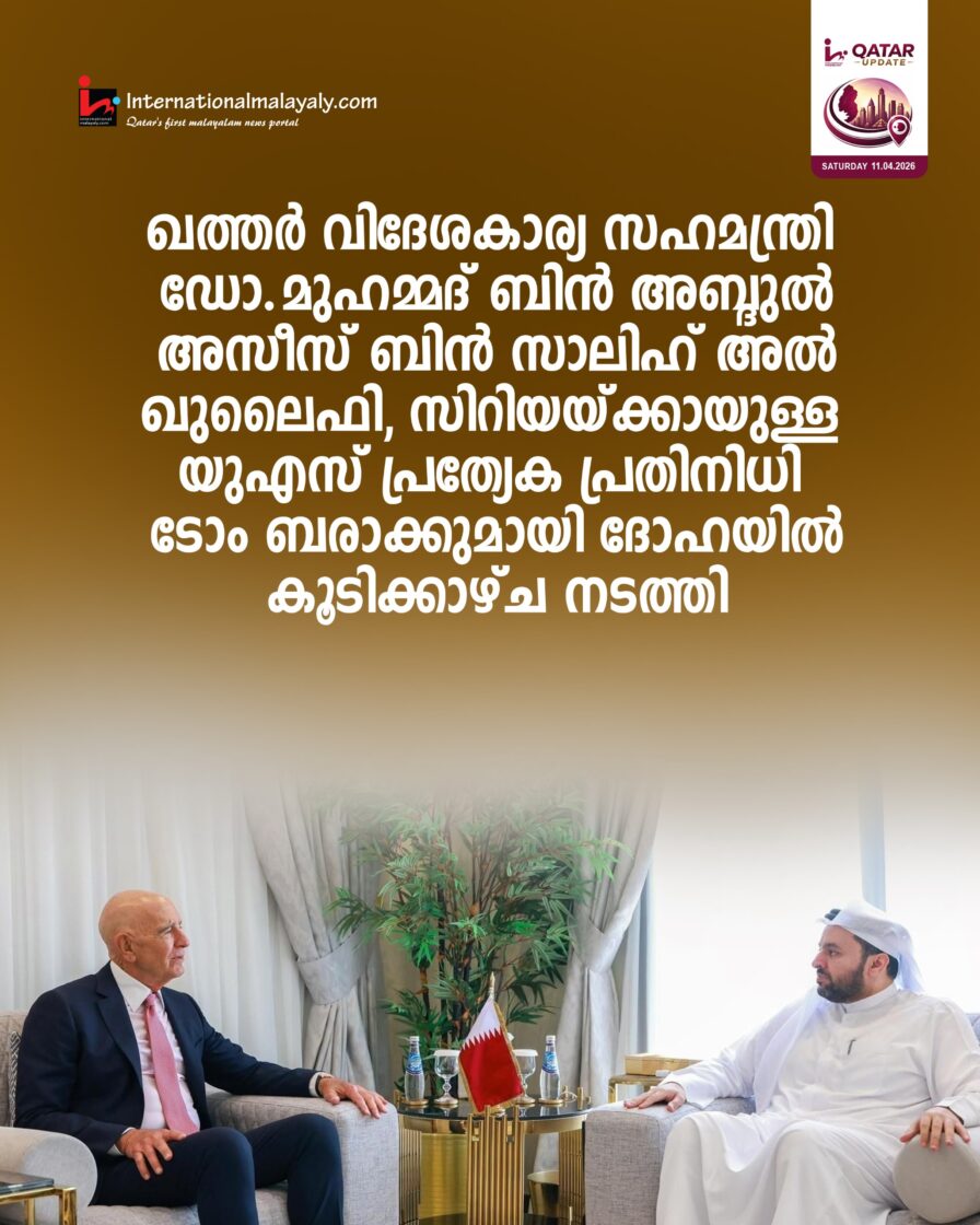 ഖത്തര് വിദേശകാര്യ സഹമന്ത്രി ഡോ. മുഹമ്മദ് ബിന് അബ്ദുല് അസീസ് ബിന് സാലിഹ് അല് ഖുലൈഫി, സിറിയയ്ക്കായുള്ള യുഎസ് പ്രത്യേക പ്രതിനിധി ടോം ബരാക്കുമായി ദോഹയില് കൂടിക്കാഴ്ച നടത്തി.