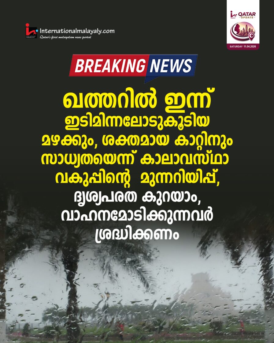 ഖത്തറില് ഇന്ന് ഇടിമിന്നലോടു കൂടിയ മഴക്കും , ശക്തമായ കാറ്റിനും സാധ്യതയെന്ന് കാലാവസ്ഥാ വകുപ്പിന്റെ മുന്നറിയിപ്പ് , ദൃശ്യപരത കുറയാം, വാഹനമോടിക്കുന്നവര് ശ്രദ്ധിക്കണം