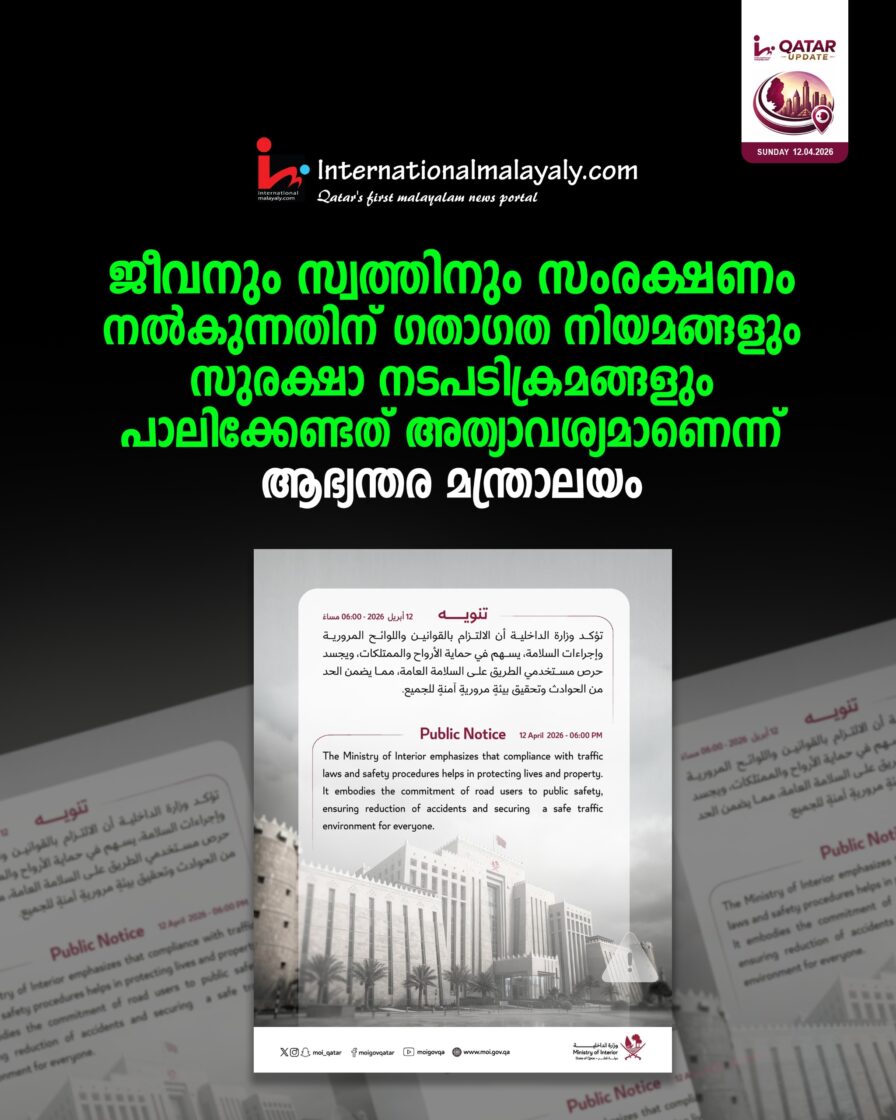 ജീവനും സ്വത്തിനും സംരക്ഷണം നല്കുന്നതിന് ഗതാഗത നിയമങ്ങളും സുരക്ഷാ നടപടിക്രമങ്ങളും പാലിക്കേണ്ടത് അത്യാവശ്യമാണെന്ന് ആഭ്യന്തര മന്ത്രാലയം