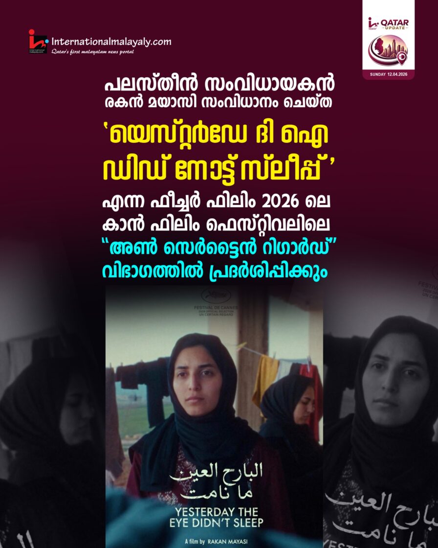 ”യെസ്റ്റര്ഡേ ദി ഐ ഡിഡ് നോട്ട് സ്ലീപ്പ്’ എന്ന ഫീച്ചര് ഫിലിം 2026 ലെ കാന് ഫിലിം ഫെസ്റ്റിവലിലെ ”അണ് സെര്ട്ടൈന് റിഗാര്ഡ്” വിഭാഗത്തില് പ്രദര്ശിപ്പിക്കും