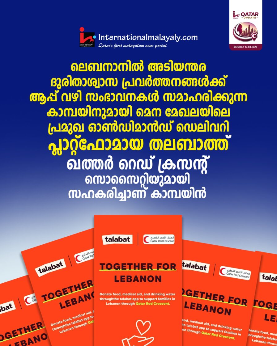 ലെബനാനില് അടിയന്തര ദുരിതാശ്വാസ പ്രവര്ത്തനങ്ങള്ക്ക് ആപ്പ് വഴി സംഭാവനകള് സമാഹരിക്കുന്ന കാമ്പയിനുമായി തലബാത്ത്