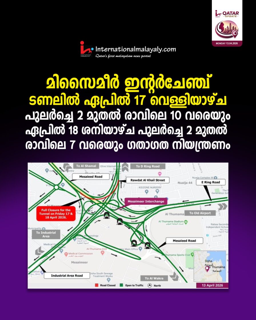 മിസൈമീര് ഇന്റര്ചേഞ്ച് ടണലില് ഏപ്രില് 17 വെള്ളിയാഴ്ച പുലര്ച്ചെ 2 മുതല് രാവിലെ 10 വരെയും ഏപ്രില് 18 ശനിയാഴ്ച പുലര്ച്ചെ 2 മുതല് രാവിലെ 7 വരെയും ഗതാഗത നിയന്ത്രണം