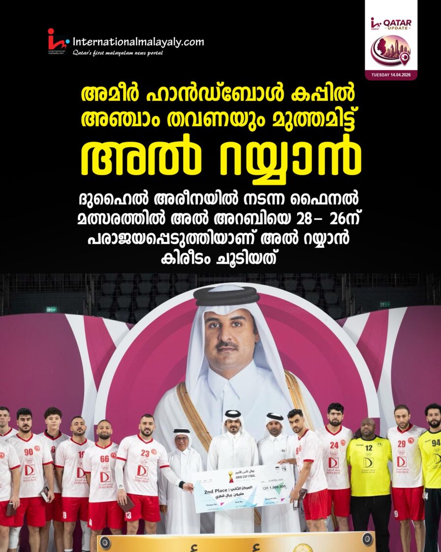 ദുഹൈല് അരീനയില് നടന്ന ഫൈനല് മത്സരത്തില് അല് അറബിയെ 28- 26ന് പരാജയപ്പെടുത്തിയാണ് അല് റയ്യാന് കിരീടം ചൂടിയത്. ഖത്തര് ഒളിമ്പിക് കമ്മിറ്റി പ്രസിഡന്റ് ശൈഖ് ജോവാന് ബിന് ഹമദ് അല് താനി അല് റയ്യാനെ 2025-2026 സീസണിലെ അമീര് ഹാന്ഡ്ബോള് കപ്പ് അല് റയ്യാന് സമ്മാനിച്ചു