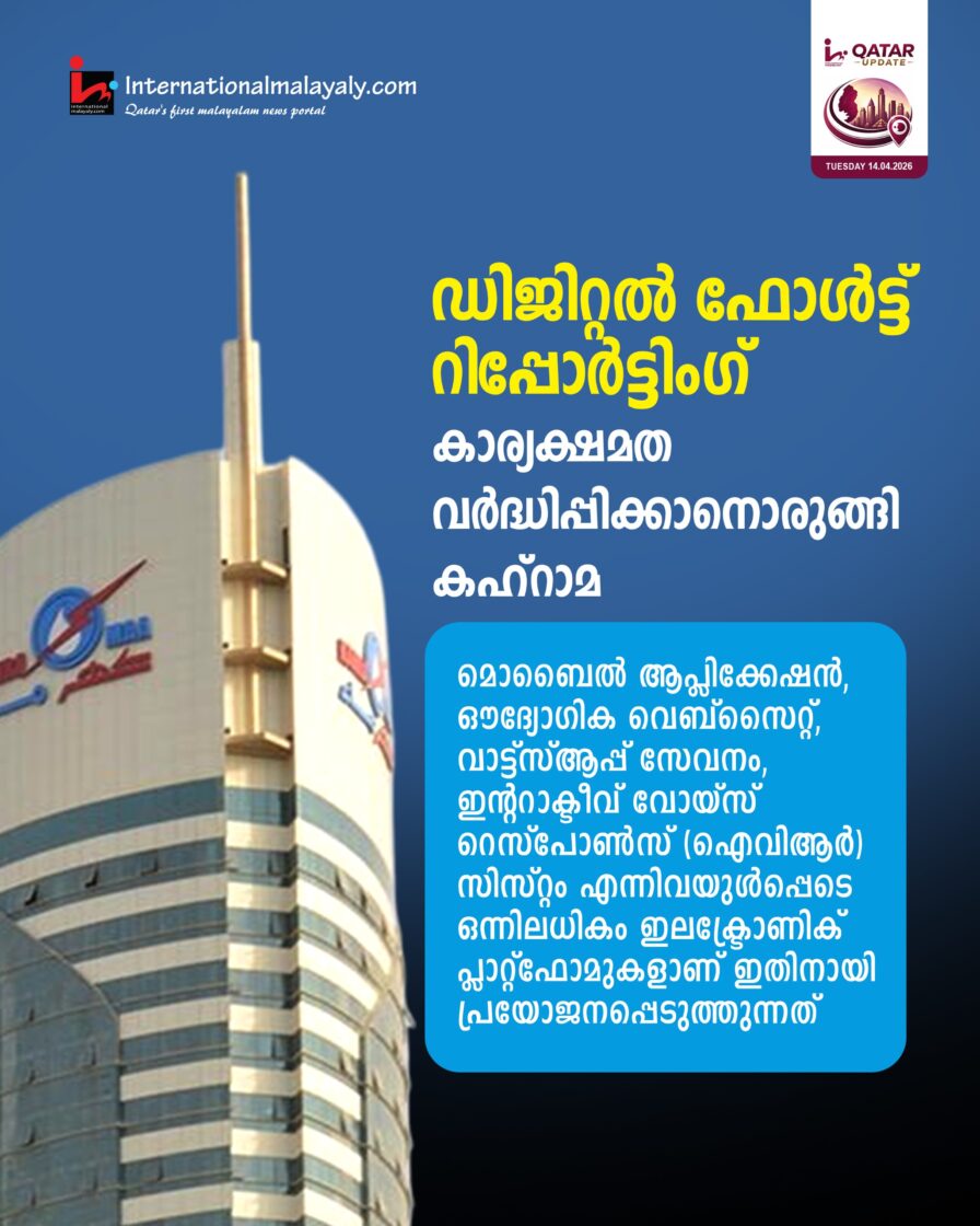 സാങ്കേതിക പിഴവുകള്ക്ക് വേഗത്തിലുള്ള പ്രതികരണം ഉറപ്പാക്കുന്നതിനും മൊത്തത്തിലുള്ള ഉപഭോക്തൃ സംതൃപ്തി മെച്ചപ്പെടുത്തുന്നതിനുമായി ഖത്തര് ജനറല് ഇലക്ട്രിസിറ്റി ആന്ഡ് വാട്ടര് കോര്പ്പറേഷന് (കഹ്റാമ) ഡിജിറ്റല് ഫോള്ട്ട് റിപ്പോര്ട്ടിംഗ് കാര്യക്ഷമത വര്ദ്ധിപ്പിച്ചുകൊണ്ടിരിക്കുകയാണെന്ന് കോണ്ടാക്റ്റ് സെന്റര് ആന്ഡ് കസ്റ്റമര് കെയര് മേധാവി മുഹമ്മദ് സലേം അല് ഷമ്മാരി ഖത്തര് ടിവിക്ക് നല്കിയ അഭിമുഖത്തില് പറഞ്ഞു.