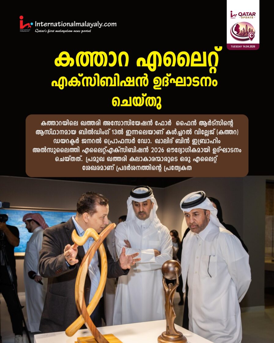 കത്താറ എലൈറ്റ് എക്സിബിഷന് ഉദ്ഘാടനം ചെയ്തു. കത്താറയിലെ ഖത്തരി അസോസിയേഷന് ഫോര് ഫൈന് ആര്ട്സിന്റെ ആസ്ഥാനമായ ബില്ഡിംഗ് 13 ല് ഇന്നലെയാണ് കള്ച്ചറല് വില്ലേജ് (കത്തറ) ഡയറക്ടര് ജനറല് പ്രൊഫസര് ഡോ. ഖാലിദ് ബിന് ഇബ്രാഹിം അല്-സുലൈത്തി എലൈറ്റ് എക്സിബിഷന് 2026 ഔദ്യോഗികമായി ഉദ്ഘാടനം ചെയ്തത്. പ്രമുഖ ഖത്തരി കലാകാരന്മാരുടെ ഒരു എലൈറ്റ് ശേഖരമാണ് പ്രദര്ശനത്തിന്റെ പ്രത്യേകത .