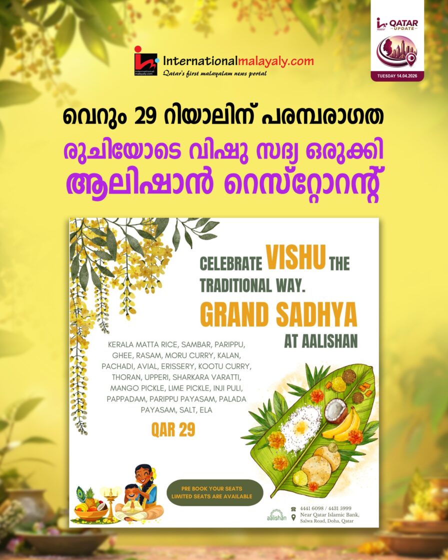 പ്രകൃതിയും മനുഷ്യനും ഒരുപോലെ പുതിയ തുടക്കങ്ങളെ സ്വാഗതം ചെയ്യുന്ന പ്രതീക്ഷയുടേയും സന്തോഷത്തിന്റേയും ആഘോഷമായ വിഷുവിന് ഖത്തര് മലയാളികള്ക്ക് പരമ്പരാഗത രുചിയോടെ വിഷു സദ്യ ഒരുക്കി സല്വ റോഡിലെ ആലിഷാന് റെസ്റ്റോറന്റ്. കേരള മട്ട അരിയില് തയ്യാറാക്കിയ ചോറ്, സാമ്പാര്, പരിപ്പ്, നെയ്യ്, രസം, മോര് കറി, കാലന്, പച്ചടി, അവിയല്, എരിശേരി, കൂട്ടുക്കറി, തോരന്, ഉപ്പേരി, ശര്ക്കര വരട്ടി, മാങ്ങ അച്ചാര്, നാരങ്ങ അച്ചാര്, ഇഞ്ചിപുളി, പപ്പടം, പരിപ്പ് പായസം, പാലട പായസം തുടങ്ങിയ വിഭവങ്ങളാണ് വാഴയിലയില് വിളമ്പുന്നത്. 44416098, 44315999 എന്നീ നമ്പറുകളില് വിളിച്ച് സീറ്റുകള് ഇപ്പോള് ബുക്ക് ചെയ്യാം.