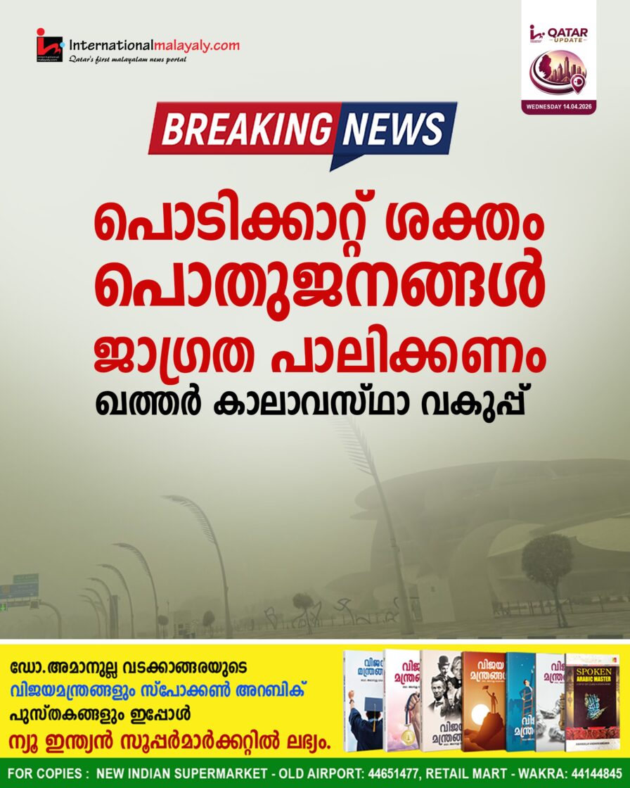 ഖത്തറിന്റെ വിവിധ ഭാഗങ്ങളില് ശക്തമായ പൊടിക്കാറ്റ് അടിച്ചുവീശുന്നതിനാല് പൊതുജനങ്ങള് ജാഗ്രത പാലിക്കണമെന്ന് ഖത്തര് കാലാവസ്ഥാ വകുപ്പ് ആവശ്യപ്പെട്ടു. ഇന്നും നാളെയും വടക്ക് പടിഞ്ഞാറന് കാറ്റിന് സാധ്യതയെന്ന് നേരത്തെ തന്നെ വകുപ്പ് മുന്നറിയിപ്പ് നല്കിയിരുന്നു.