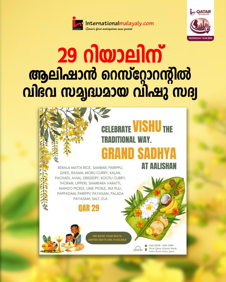 പ്രകൃതിയും മനുഷ്യനും ഒരുപോലെ പുതിയ തുടക്കങ്ങളെ സ്വാഗതം ചെയ്യുന്ന പ്രതീക്ഷയുടേയും സന്തോഷത്തിന്റേയും ആഘോഷമായ വിഷുവിന് ഖത്തര് മലയാളികള്ക്ക് പരമ്പരാഗത രുചിയോടെ വിഷു സദ്യ ഒരുക്കി സല്വ റോഡിലെ ആലിഷാന് റെസ്റ്റോറന്റ്. കേരള മട്ട അരിയില് തയ്യാറാക്കിയ ചോറ്, സാമ്പാര്, പരിപ്പ്, നെയ്യ്, രസം, മോര് കറി, കാലന്, പച്ചടി, അവിയല്, എരിശേരി, കൂട്ടുക്കറി, തോരന്, ഉപ്പേരി, ശര്ക്കര വരട്ടി, മാങ്ങ അച്ചാര്, നാരങ്ങ അച്ചാര്, ഇഞ്ചിപുളി, പപ്പടം, പരിപ്പ് പായസം, പാലട പായസം തുടങ്ങിയ വിഭവങ്ങളാണ് വാഴയിലയില് വിളമ്പുന്നത്. 44416098, 44315999 എന്നീ നമ്പറുകളില് വിളിച്ച് സീറ്റുകള് ഇപ്പോള് ബുക്ക് ചെയ്യാം.