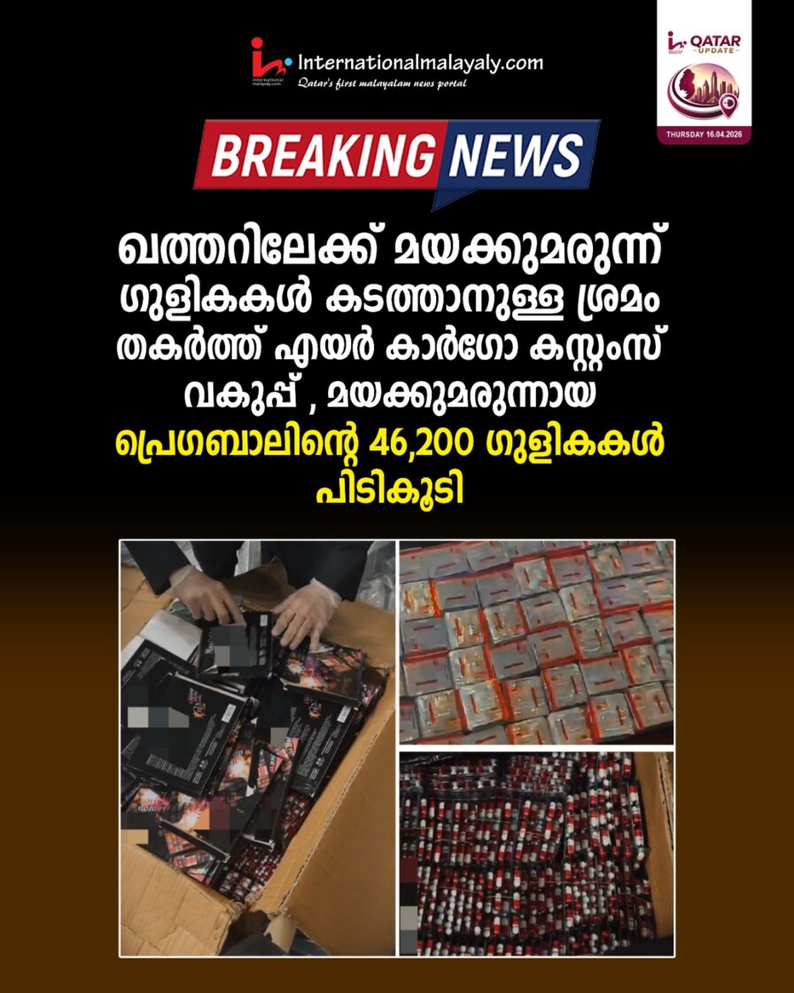 ഖത്തറിലേക്ക് മയക്കുമരുന്ന് ഗുളികകള് കടത്താനുള്ള ശ്രമം തകര്ത്ത് എയര് കാര്ഗോ കസ്റ്റംസ് വകുപ്പ് , മയക്കുമരുന്നായ പ്രെഗബാലിന്റെ 46,200 ഗുളികകള് പിടികൂടി