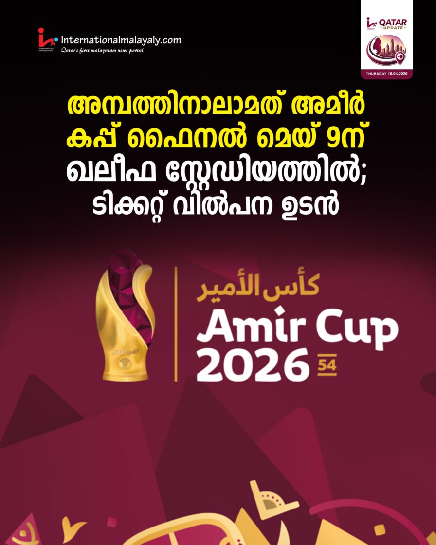 കാല്പന്തുകളിയുടെ ഖത്തറിലെ ഏറ്റവും വലിയ വാര്ഷിക മത്സരമായ അമ്പത്തിനാലാമത് അമീര് കപ്പ് ഫൈനല് മെയ് 9ന് ഖലീഫ സ്റ്റേഡിയത്തില് നടക്കും. ടിക്കറ്റ് ഓണ്ലൈന് വില്പന മെയ് 2ന് ആരംഭിക്കുമെന്ന് ഖത്തര് ഫുട്ബോള് അസോസിയേഷന് അറിയിച്ചു.