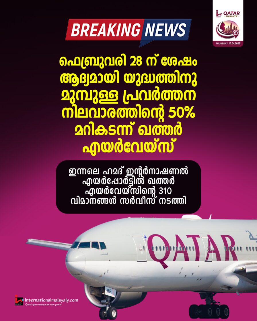 ഫെബ്രുവരി 28 ന് ശേഷം ആദ്യമായി യുദ്ധത്തിനു മുമ്പുള്ള പ്രവര്ത്തന നിലവാരത്തിന്റെ 50% മറികടന്ന് ഖത്തര് എയര്വേയ്സ്