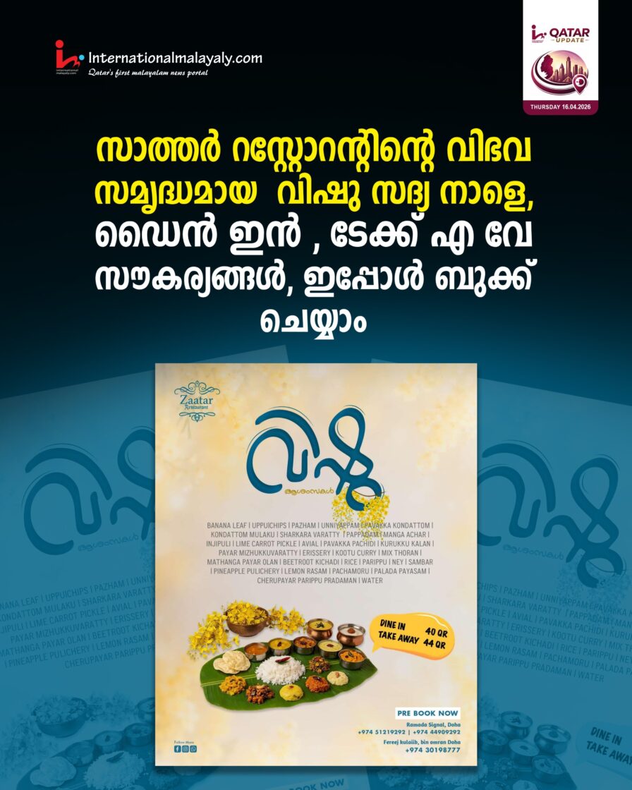 സാത്തര് റസ്റ്റോറന്റിന്റെ വിഭവ സമൃദ്ധമായ വിഷു സദ്യ നാളെ, ഡൈന് ഇന് , ടേക്ക് എ വേ സൗകര്യങ്ങള്, ഇപ്പോള് ബുക്ക് ചെയ്യാം