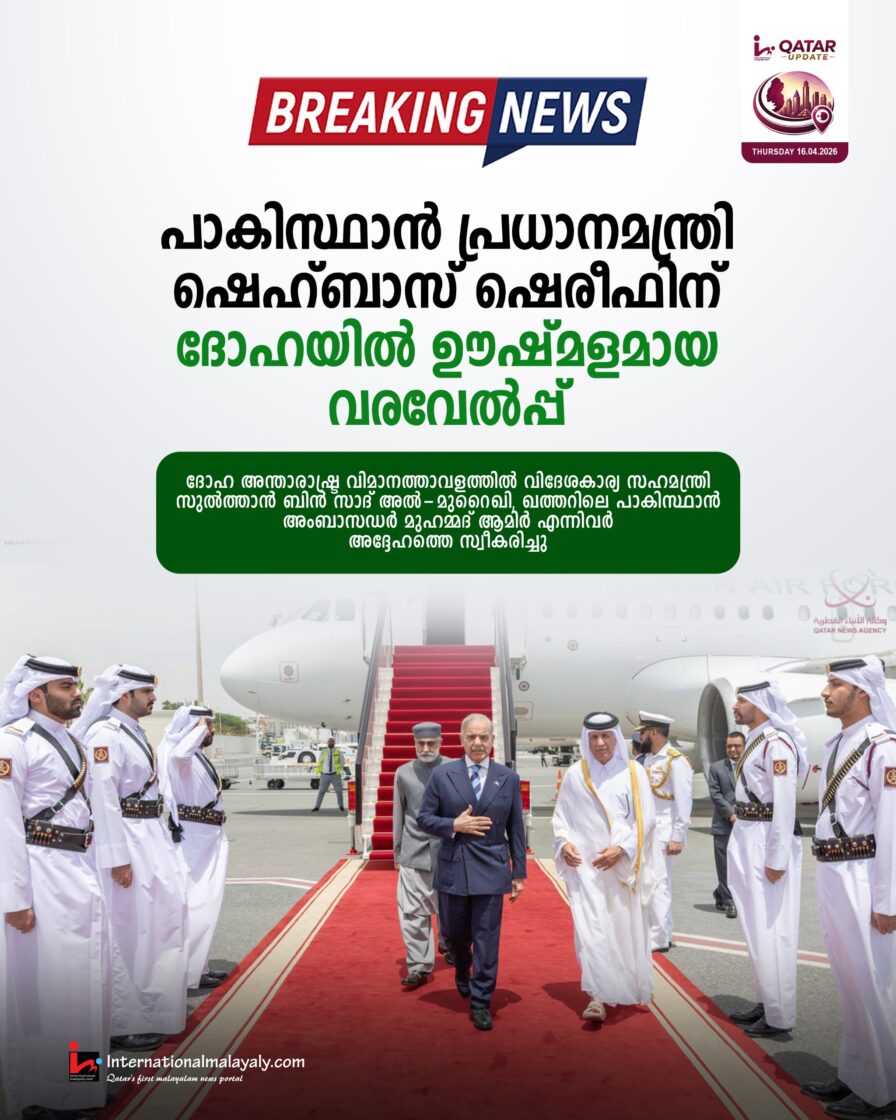 പാകിസ്ഥാന് പ്രധാനമന്ത്രി ഷെഹ്ബാസ് ഷെരീഫിന് ദോഹയില് ഊഷ്മളമായ വരവേല്പ്പ് . ഔദ്യോഗിക സന്ദര്ശനത്തിനായി ദോഹയിലെത്തിയ പ്രധാനമന്ത്രിയേയും ഔദ്യോഗിക പ്രതിനിധി സംഘത്തേയും