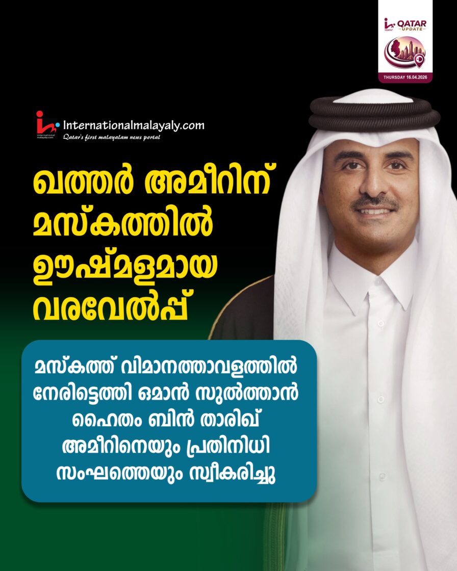 ഖത്തര് അമീറിന് മസ്കത്തില് ഊഷ്മളമായ വരവേല്പ്പ് , മസ്കത്ത് വിമാനത്താവളത്തില് നേരിട്ടെത്തി ഒമാന് സുല്ത്താന് ഹൈതം ബിന് താരിഖ് അമീറിനെയും പ്രതിനിധി സംഘത്തെയും സ്വീകരിച്ചു