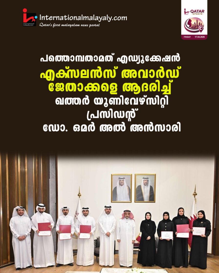 എഡ്യൂക്കേഷന് എക്സലന്സ് അവാര്ഡ് ജേതാക്കളെ ആദരിച്ച് ഖത്തര് യൂണിവേഴ്സിറ്റി പ്രസിഡന്റ് ഡോ. ഒമര് അല് അന്സാരി