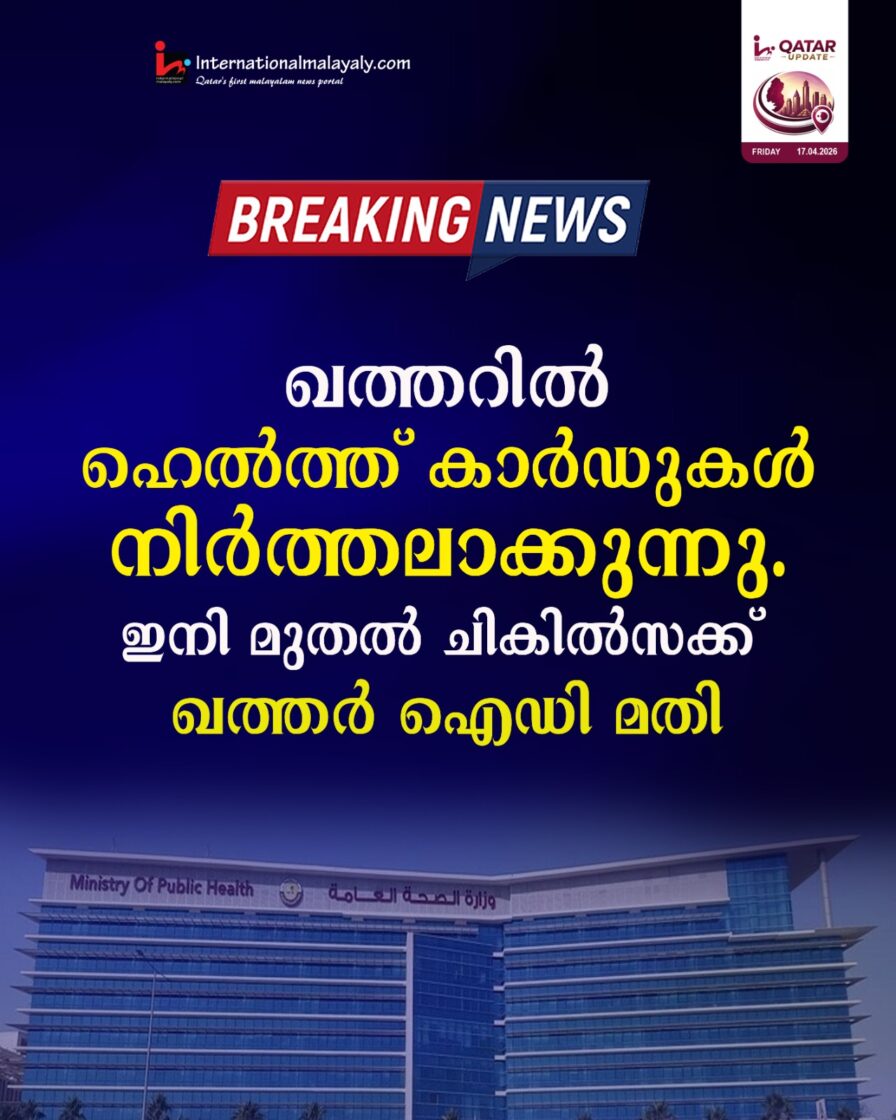 ഹമദ് മെഡിക്കല് കോര്പ്പറേഷന്, പ്രൈമറി ഹെല്ത്ത് കെയര് കോര്പ്പറേഷന്, മറ്റ് സര്ക്കാര് ആരോഗ്യ മേഖല സ്ഥാപനങ്ങള് എന്നിവയില് ചികില്സ തേടുന്നതിന് ഇനി മുതല് ഹെല്ത്ത് കാര്ഡിന് പകരം സാധുവായ ദേശീയ ഐഡി നതിയാകുമെന്ന് പൊതുജനാരോഗ്യ മന്ത്രി മന്സൂര് ബിന് ഇബ്രാഹിം ബിന് സാദ് അല് മഹ്മൂദ് സര്ക്കുലര് പുറപ്പെടുവിച്ചു.