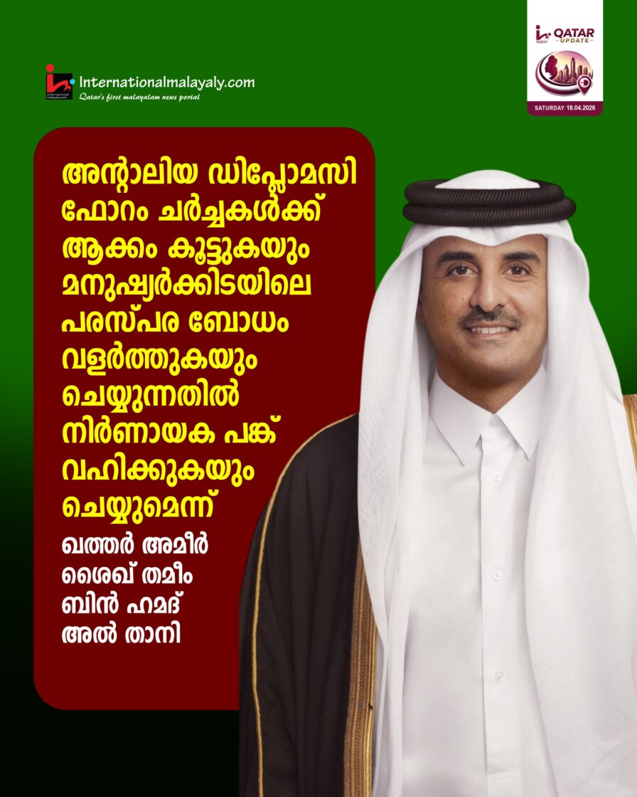 അന്റാലിയ ഡിപ്ലോമസി ഫോറം ചര്ച്ചകള്ക്ക് ആക്കം കൂട്ടുകയും മനുഷ്യര്ക്കിടയിലെ പരസ്പര ബോധം വളര്ത്തുകയും ചെയ്യുന്നതില് നിര്ണായക പങ്ക് വഹിക്കുകയും ചെയ്യുമെന്ന് ഖത്തര് അമീര് ശൈഖ് തമീം ബിന് ഹമദ് അല് താനി