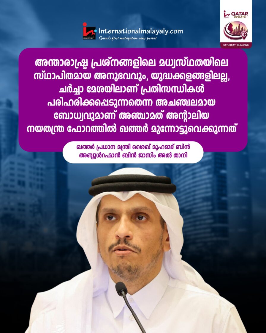 അന്താരാഷ്ട്ര പ്രശ്നങ്ങളിലെ മധ്യസ്ഥതയിലെ സ്ഥാപിതമായ അനുഭവവും, യുദ്ധക്കളങ്ങളിലല്ല, ചര്ച്ചാ മേശയിലാണ് പ്രതിസന്ധികള് പരിഹരിക്കപ്പെടുന്നതെന്ന അചഞ്ചലമായ ബോധ്യവുമാണ് അഞ്ചാമത് അന്റാലിയ നയതന്ത്ര ഫോറത്തില് ഖത്തര് മുന്നോട്ടുവെക്കുന്നതെന്ന് പ്രധാനമന്ത്രിയും വിദേശകാര്യ മന്ത്രിയുമായ ശൈഖ് മുഹമ്മദ് ബിന് അബ്ദുള്റഹ്മാന് ബിന് ജാസിം അല്താനി എക്സ് പ്ലാറ്റ്ഫോമില് കുറിച്ചു
