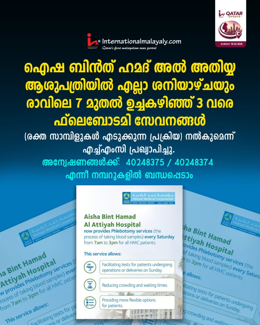 ഐഷ ബിന്ത് ഹമദ് അല് അതിയ്യ ആശുപത്രിയില് എല്ലാ ശനിയാഴ്ചയും രാവിലെ 7 മുതല് ഉച്ചകഴിഞ്ഞ് 3 വരെ ഫ്ലെബോടമി സേവനങ്ങള് (രക്ത സാമ്പിളുകള് എടുക്കുന്ന പ്രക്രിയ) നല്കുമെന്ന് എച്ച്എംസി പ്രഖ്യാപിച്ചു.