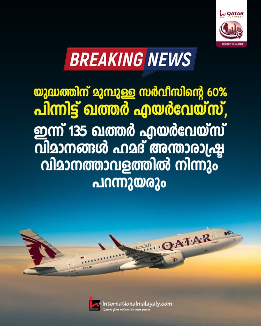 യുദ്ധത്തിന് മുമ്പുള്ള സര്വീസിന്റെ 60% പിന്നിട്ട് ഖത്തര് എയര്വേയ്സ്, ഇന്ന് 135 ഖത്തര് എയര്വേയ്സ് വിമാനങ്ങള് ഹമദ് അന്താരാഷ്ട്ര വിമാനത്താവളത്തില് നിന്നും പറന്നുയരും