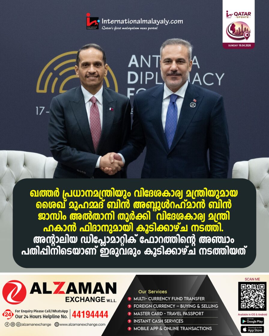ഖത്തര് പ്രധാനമന്ത്രിയും വിദേശകാര്യ മന്ത്രിയുമായ ശൈഖ് മുഹമ്മദ് ബിന് അബ്ദുള്റഹ്മാന് ബിന് ജാസിം അല്താനി തുര്ക്കി വിദേശകാര്യ മന്ത്രി ഹകാന് ഫിദാനുമായി കൂടിക്കാഴ്ച നടത്തി. അന്റാലിയ ഡിപ്ലോമാറ്റിക് ഫോറത്തിന്റെ അഞ്ചാം പതിപ്പിനിടെയാണ് ഇരുവരും കൂടിക്കാഴ്ച നടത്തിയത്