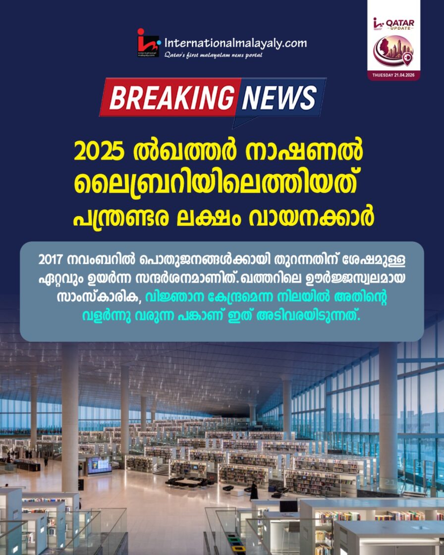 2025 ല് ഖത്തര് നാഷണല് ലൈബ്രറിയിലെത്തിയത് പന്ത്രണ്ടര ലക്ഷം വായനക്കാര് . 2017 നവംബറില് പൊതുജനങ്ങള്ക്കായി തുറന്നതിന് ശേഷമുള്ള ഏറ്റവും ഉയര്ന്ന സന്ദര്ശനമാണിത്.ഖത്തറിലെ ഊര്ജ്ജസ്വലമായ സാംസ്കാരിക, വിജ്ഞാന കേന്ദ്രമെന്ന നിലയില് അതിന്റെ വളര്ന്നുവരുന്ന പങ്കാണ് ഇത് അടിവരയിടുന്നത്.