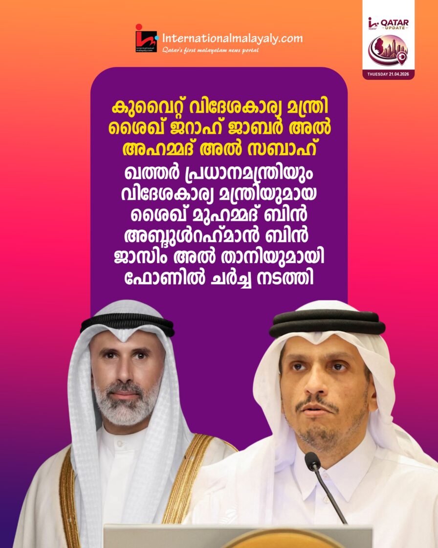 കുവൈറ്റ് വിദേശകാര്യ മന്ത്രി ശൈഖ് ജറാഹ് ജാബര് അല് അഹമ്മദ് അല് സബാഹ് ഖത്തര് പ്രധാനമന്ത്രിയും വിദേശകാര്യ മന്ത്രിയുമായ ശൈഖ് മുഹമ്മദ് ബിന് അബ്ദുള്റഹ്മാന് ബിന് ജാസിം അല് താനിയുമായി ഫോണില് ചര്ച്ച നടത്തി