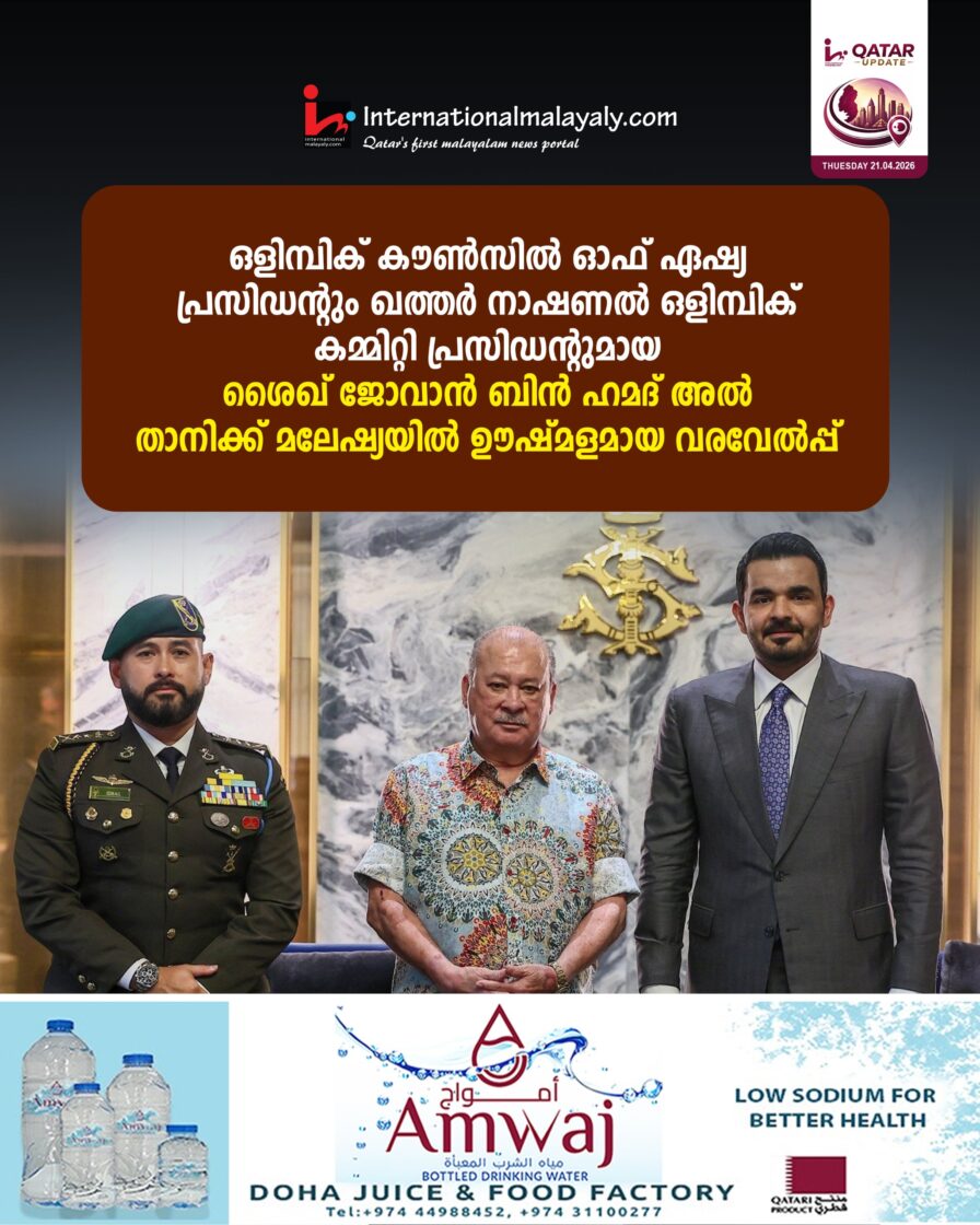 ഒളിമ്പിക് കൗണ്സില് ഓഫ് ഏഷ്യ പ്രസിഡന്റും ഖത്തര് നാഷണല് ഒളിമ്പിക് കമ്മിറ്റി പ്രസിഡന്റുമായ ശൈഖ് ജോവാന് ബിന് ഹമദ് അല് താനിക്ക് മലേഷ്യയില് ഊഷ്മളമായ വരവേല്പ്പ് .