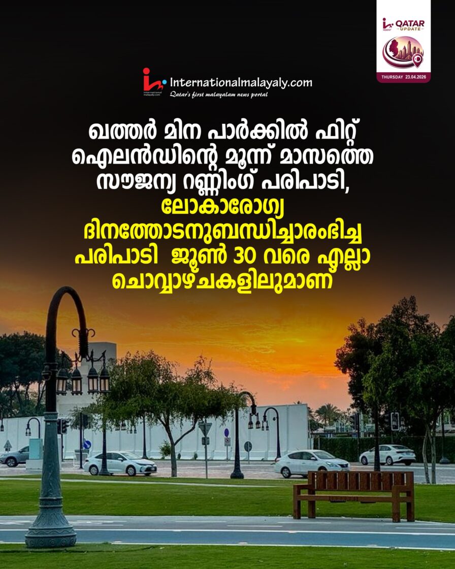 ഖത്തര് മിന പാര്ക്കില് ഫിറ്റ് ഐലന്ഡിന്റെ മൂന്ന് മാസത്തെ സൗജന്യ റണ്ണിംഗ് പരിപാടി , ലോകാരോഗ്യ ദിനത്തോടനുബന്ധിച്ചാരംഭിച്ച പരിപാടി ജൂണ് 30 വരെ എല്ലാ ചൊവ്വാഴ്ചകളിലുമാണ്