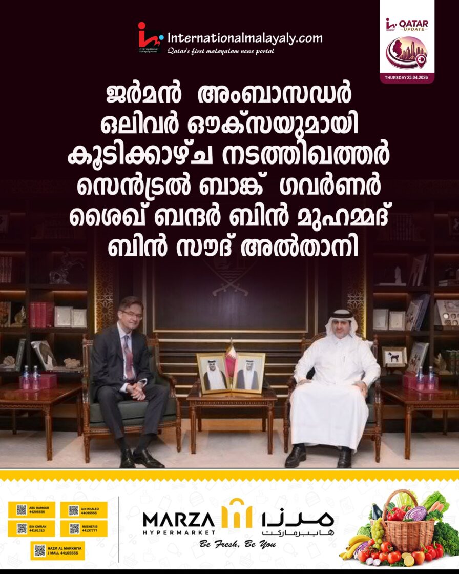 ജര്മന് അംബാസഡര് ഒലിവര് ഔക്സയുമായി കൂടിക്കാഴ്ച നടത്തി ഖത്തര് സെന്ട്രല് ബാങ്ക് ഗവര്ണര് ശൈഖ് ബന്ദര് ബിന് മുഹമ്മദ് ബിന് സൗദ് അല്-താനി