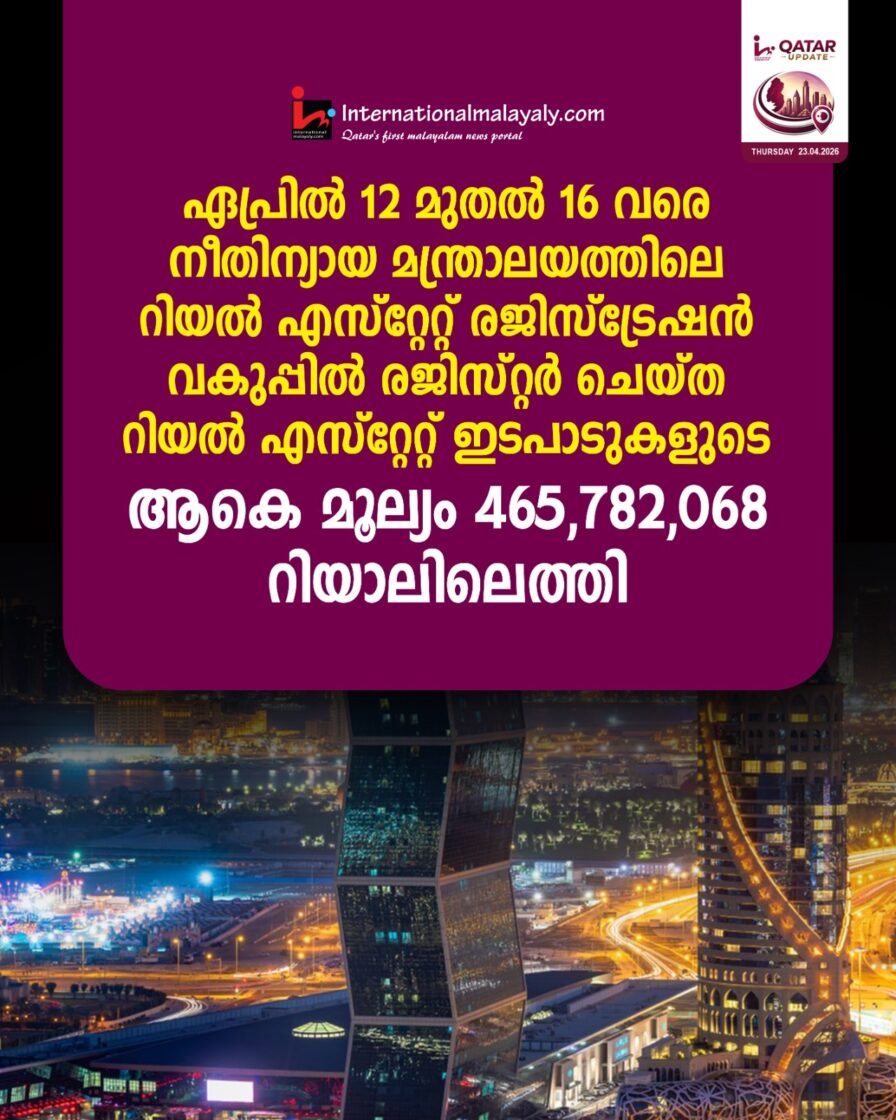 ഏപ്രില്‍ 12 മുതല്‍ 16 വരെ നീതിന്യായ മന്ത്രാലയത്തിലെ റിയല്‍ എസ്റ്റേറ്റ് രജിസ്‌ട്രേഷന്‍ വകുപ്പില്‍ രജിസ്റ്റര്‍ ചെയ്ത റിയല്‍ എസ്റ്റേറ്റ് ഇടപാടുകളുടെ ആകെ മൂല്യം 465,782,068 റിയാലിലെത്തി
