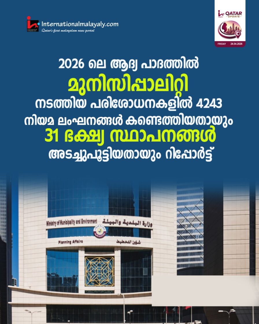 2026 ലെ ആദ്യ പാദത്തില് മുനിസിപ്പാലിറ്റി നടത്തിയ പരിശോധനകളില് 4243 നിയമ ലംഘനങ്ങൾ കണ്ടെത്തിയതായും 31 ഭക്ഷ്യ സ്ഥാപനങ്ങള് അടച്ചുപൂട്ടിയതായും റിപ്പോര്ട്ട്