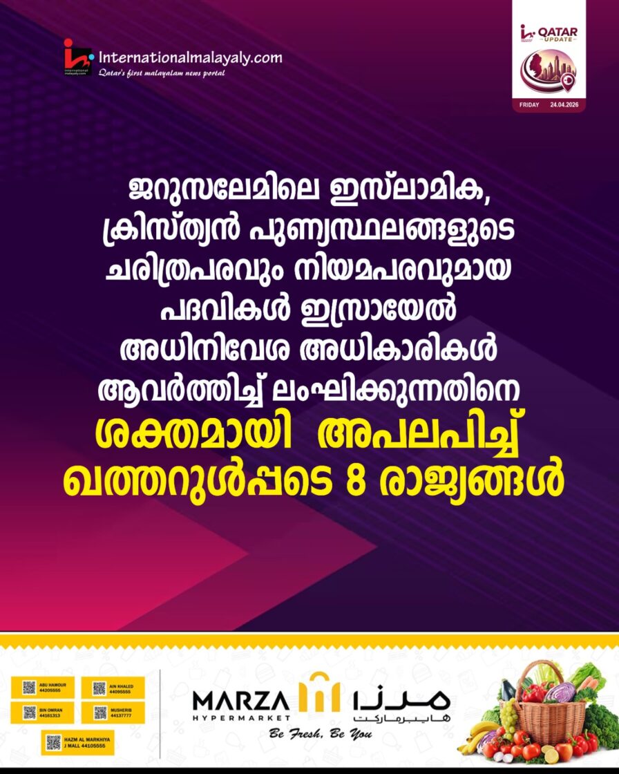 ജറുസലേമിലെ ഇസ് ലാമിക, ക്രിസ്ത്യന് പുണ്യസ്ഥലങ്ങളുടെ ചരിത്രപരവും നിയമപരവുമായ പദവികള് ഇസ്രായേല് അധിനിവേശ അധികാരികള് ആവര്ത്തിച്ച് ലംഘിക്കുന്നതിനെ ശക്തമായി അപലപിച്ച് ഖത്തറുള്പ്പടെ 8 രാജ്യങ്ങള്