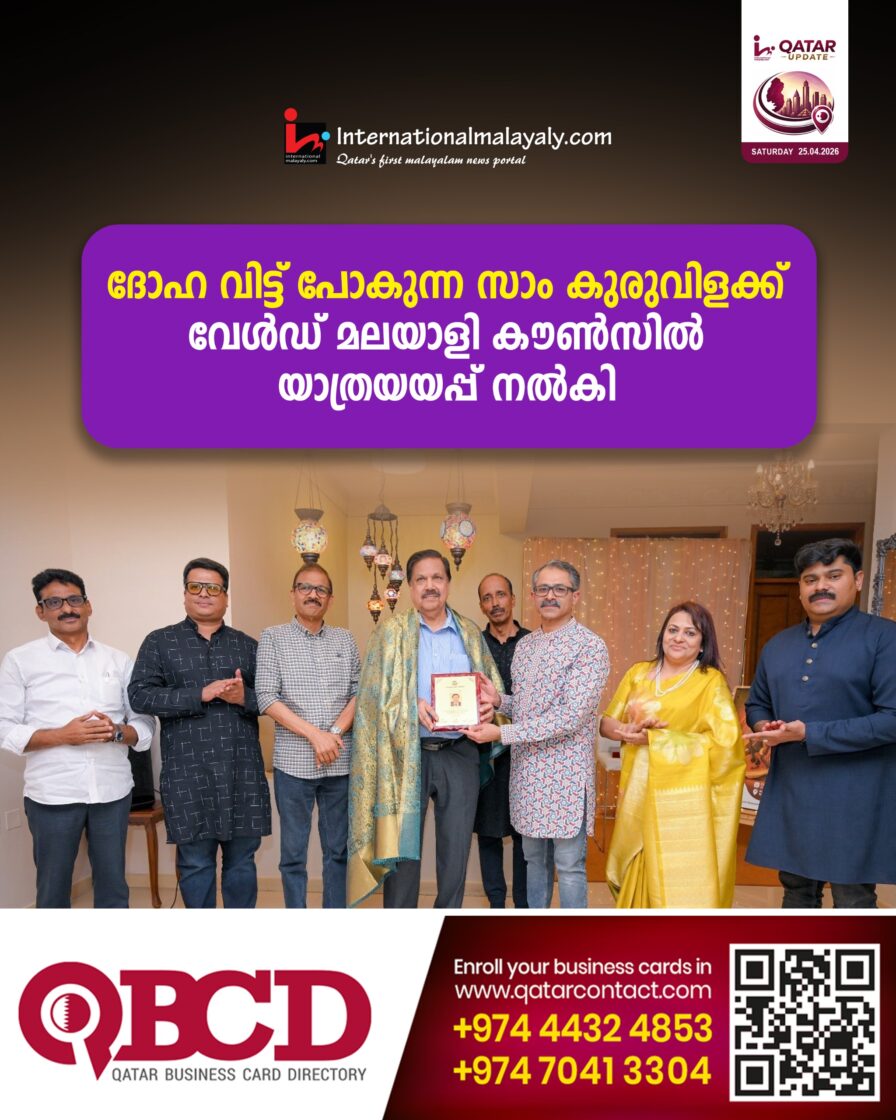 ദോഹയിലെ 50 വര്ഷത്തെ പ്രവാസ ജീവിതത്തിന് ശേഷം നാട്ടിലേക്ക് മടങ്ങുന്ന വേള്ഡ് മലയാളി കൗണ്സില് ഉപദേശക സമിതി അംഗവും മുന് വൈസ് പ്രസിഡന്റുമായ സാം കുരുവിളയ്ക്ക് വേള്ഡ് മലയാളി കൗണ്സില് ഖത്തര് ഘടകം യാത്രയയപ്പ് നല്കി . ഉപദേശക സമിതി ചെയര്മാന് വി എസ് നാരായണന്, ചെയര്മാന് സുരേഷ് കരിയാട്, പ്രസിഡന്റ് സിയാദ് ഉസ്മാന്, ജനറല് സെക്രട്ടറി രഞ്ജിത്ത് ചാലില്, ട്രഷറര് ജിജി ജോണ്, വനിതാ ഫോറം പ്രസിഡന്റ് ഡോ. ഷീല ഫിലിപ്പോസ്, യൂത്ത് ഫോറം പ്രസിഡന്റ് ബി എം ഫാസില്, കാജല് മൂസ, ഷംസുദീന് ഇസ്മായില്, വനിതാ ഫോറം ഗ്ലോബല് വൈസ് പ്രസിഡന്റ് ഷഹാന അബ്ദുള് കാദര്, ജോണ് ഗില്ബെര്ട്ട്, എബ്രഹാം ജോസഫ്, വിനോദ് പുത്തന്വീട്ടില് എന്നിവര് സംസാരിച്ചു.